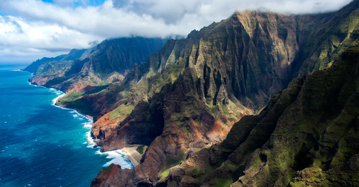 The island of Kaua’i is defined by colours. Green is rich across the region, seen in its thickets of emerald jungle, and the colour of rust blankets its remote national parks. Aquamarine reefs fringe the coastline, and Hawaii’s signature frangipani bursts in bouquets of pink and white down every street. This polychromatic display is putting on a full performance for us through the window of our Blue Hawaiian helicopter, which is flying between the jagged sea cliffs of the Nā Pali Coast State Wilderness Park.