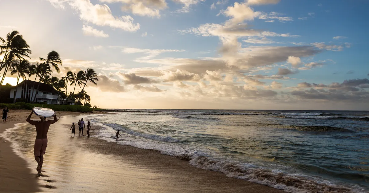 Every Hawaiian island has a nickname, and Kaua’i is known as the Garden Isle. Its tropical climate, dense jungle and waterfalls make it one of the wettest places on Earth, but Hawaii’s monicker – the Rainbow State – hints that it’s not all rain on these islands. We’re here in September, the shoulder season, and our weather fears were allayed from the moment we landed at Lihue Airport, after a short, 50-minute flight from Maui, with clear blue skies guiding our journey. Half of our time in Kaua’i is spent on the south coast in Po’ipū – a short drive from the airport and the location of most large resorts and hotels. Everywhere we go, we’re greeted with a floral lei and an aloha, which we learn doesn’t just mean ‘hello’, but is a philosophy of love, kindness and harmony. We while away our first evening at the beach, which is a nesting site for honu (Hawaiian green sea turtles). I watch as a local surfer riding a wave is silhouetted against a flaming sky and hope it’s a sign of good weather to come.