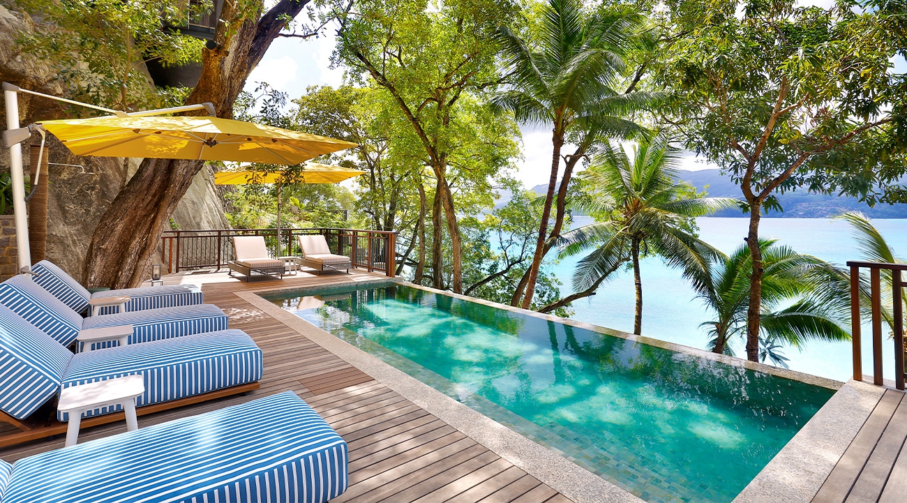 At the other end of the property is one of the Seychelles’ largest accommodations, Cliff House Villa, with 13 bedrooms. It’s built into the hillside with a stunning vantage point over the ocean and an elevated pool.