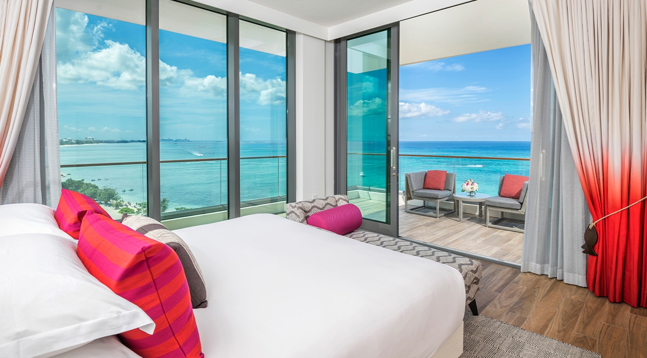 You’d be hard-pressed to find a hotel with a better location than Kimpton Seafire, located on the shores of pristine Seven Mile Beach. The hotel is west-facing, meaning guests enjoy the most outstanding technicolour sunsets – something I quickly discover on arrival, with the sky illuminated in half a dozen shades of red as I check in.