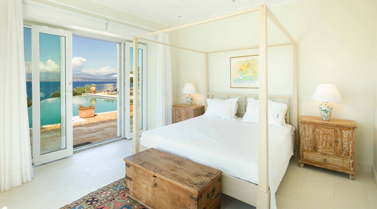 A key factor of Above properties is excellent location, and Villa Soukia ticks all the boxes: direct beach access, a private jetty and just a 10-minute walk into Kassiopi. St Stefano and the quiet pebbled beaches of Coyevinas and Avlaki are also in easy reach. French doors in the large living room open out onto a spacious wraparound terrace, centred around an infinity pool flanked by loungers. There’s ample options for alfresco drinking and dining, with outdoor seating, a built-in barbecue, an outdoor kitchen and pizza oven. Another hallmark of Above properties is the view: for us, it’s a wide-reaching vista looking out over the Ionian Sea and the distant hills of nearby Albania, which glitter with light as darkness falls.