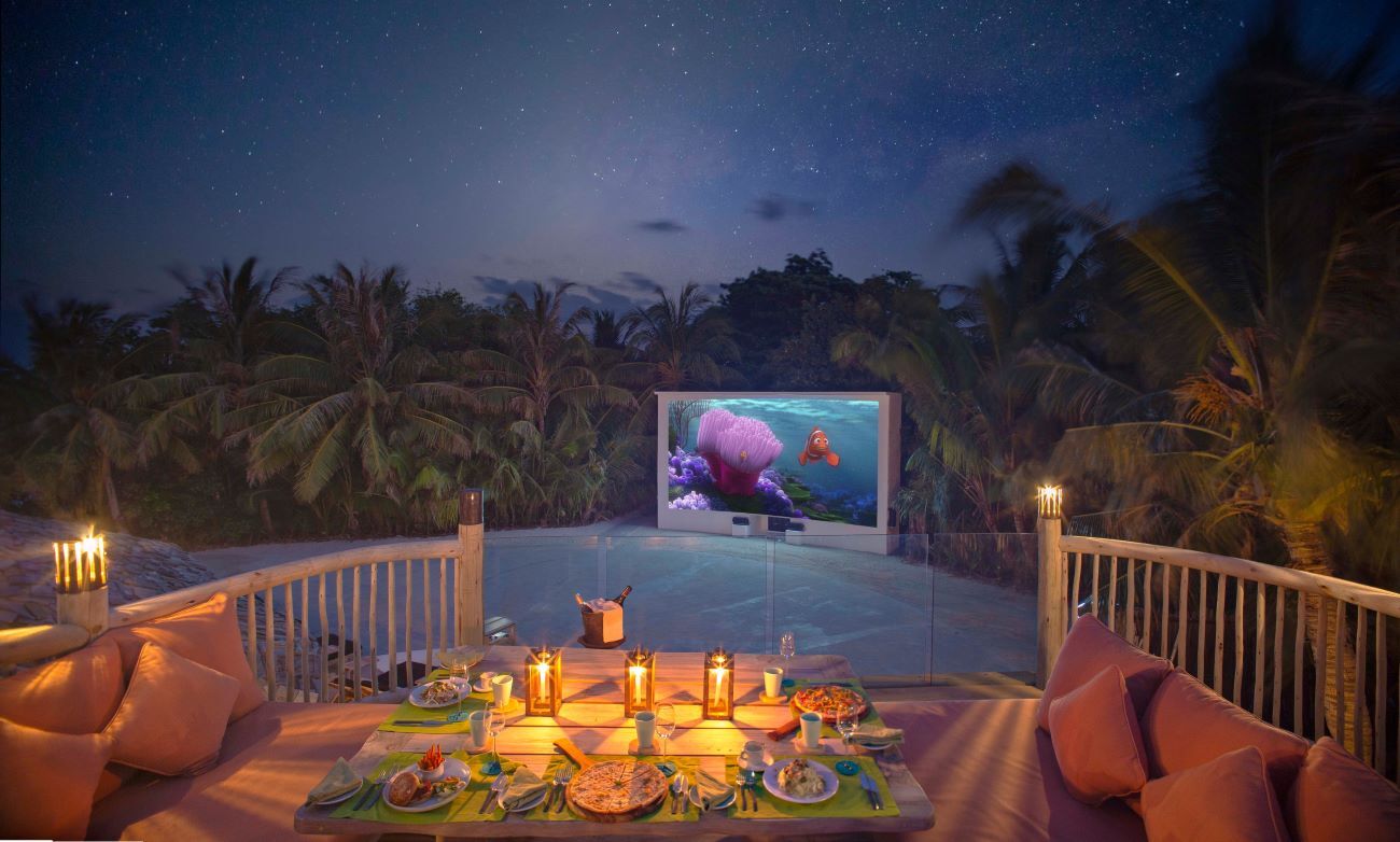 At Soneva Jani’s Crab Shack we feast on the largest crustaceans I have ever seen, all while our legs motion back and forth on the swing chairs that hang from the ceiling. At Director’s Cut, a restaurant with an outdoor cinema, we enjoy what almost feels like a couple’s dinner as our son sits quietly and enjoys a screening of Frozen. There’s an assortment of dining options to be enjoyed, but a highlight at Jani is the weekly food market-style dinner experience on the beach. In total, Jani has 10 dining options and Fushi has 11.The food at Fushi feels a little more refined; our favourites include southeast Asian venue Out of the Blue and treetop restaurant Fresh in the Garden, where guests dine high above verdant foliage. Lunch at Out of the Sea is a must, but it’s also the springboard for water-based adventures, including snorkelling with shoals of fish. From here, we board the hotel’s yacht for a sunset dolphin cruise and watch these spirited creatures play in the calm waters as the sun dips on the horizon, leaving pink and orange hues in its wake.