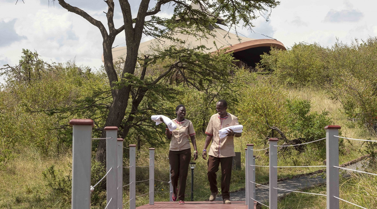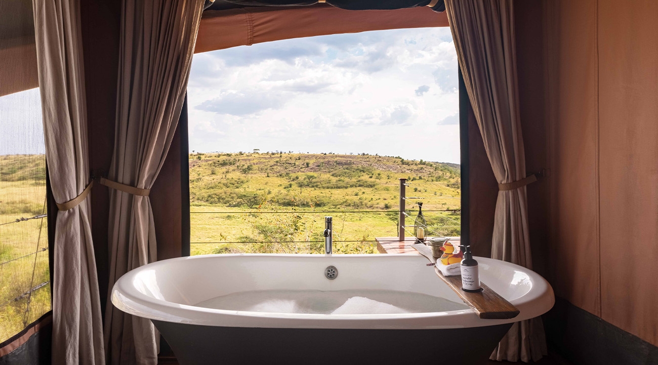At first glance, the tents – built atop soaring steel arches – look a little surreal, like giant manta rays swooping above the valley. But a closer look reveals the design drew inspiration from a Maasai warrior’s bow and arrow. While the exteriors push the boundaries, the interiors are altogether more traditional, with locally made wooden furniture, bamboo light fixtures, Maasai art above the bed and a bathroom boasting a walk-in shower and freestanding bath overlooking the valley.