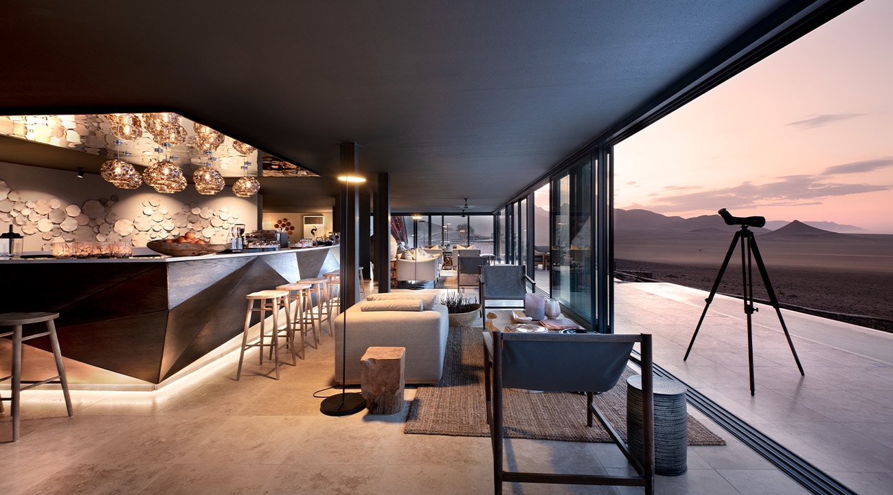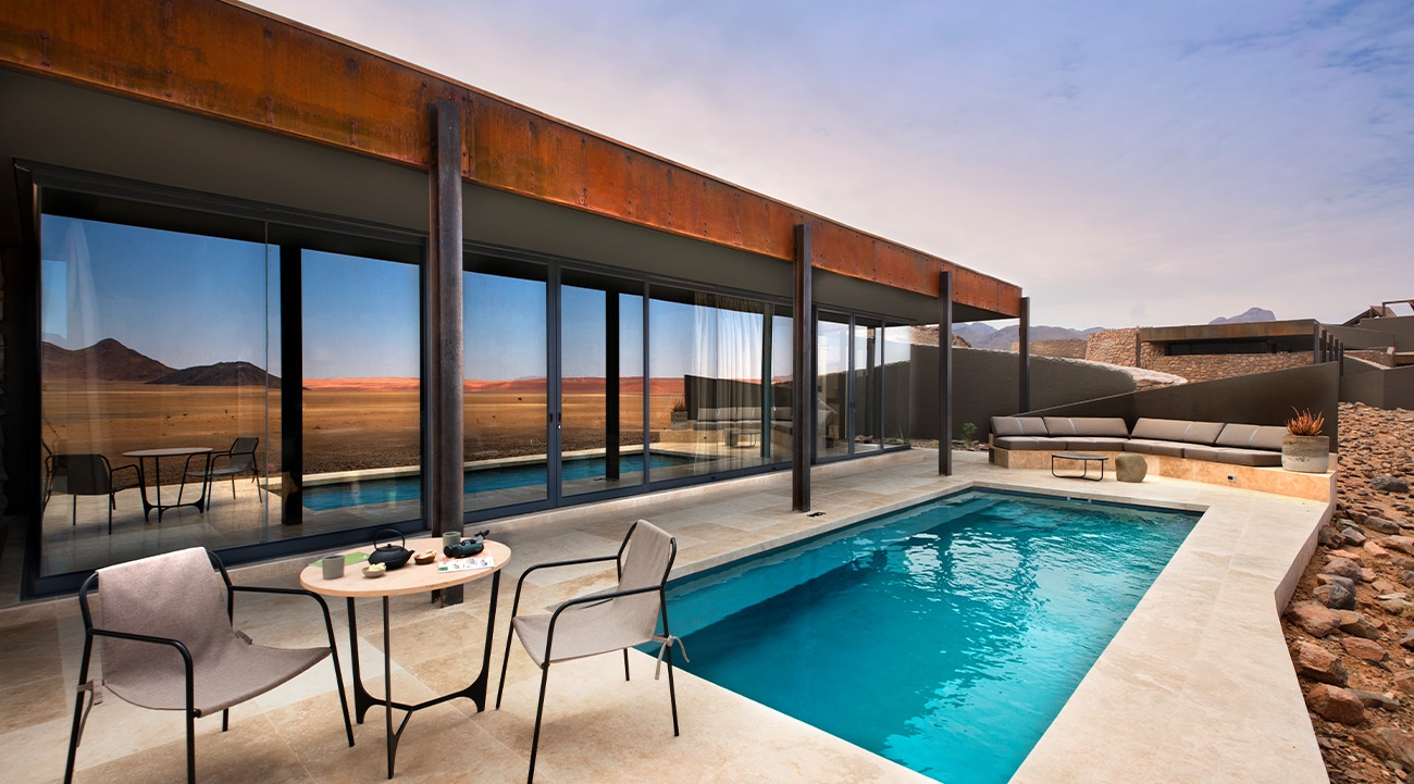 Sitting in a private concession covering more than 31,000 acres, andBeyond Sossusvlei Desert Lodge is sublime. Just 11 spectacular suites flank a dramatically designed central guest area. The low-impact rock, glass and steel structures blend into the hillside behind them, and in front a vast, oryx-dotted plain stretches away to the base of lofty peaks that cycle through shades of ink, chocolate, heather and ochre as the light changes.