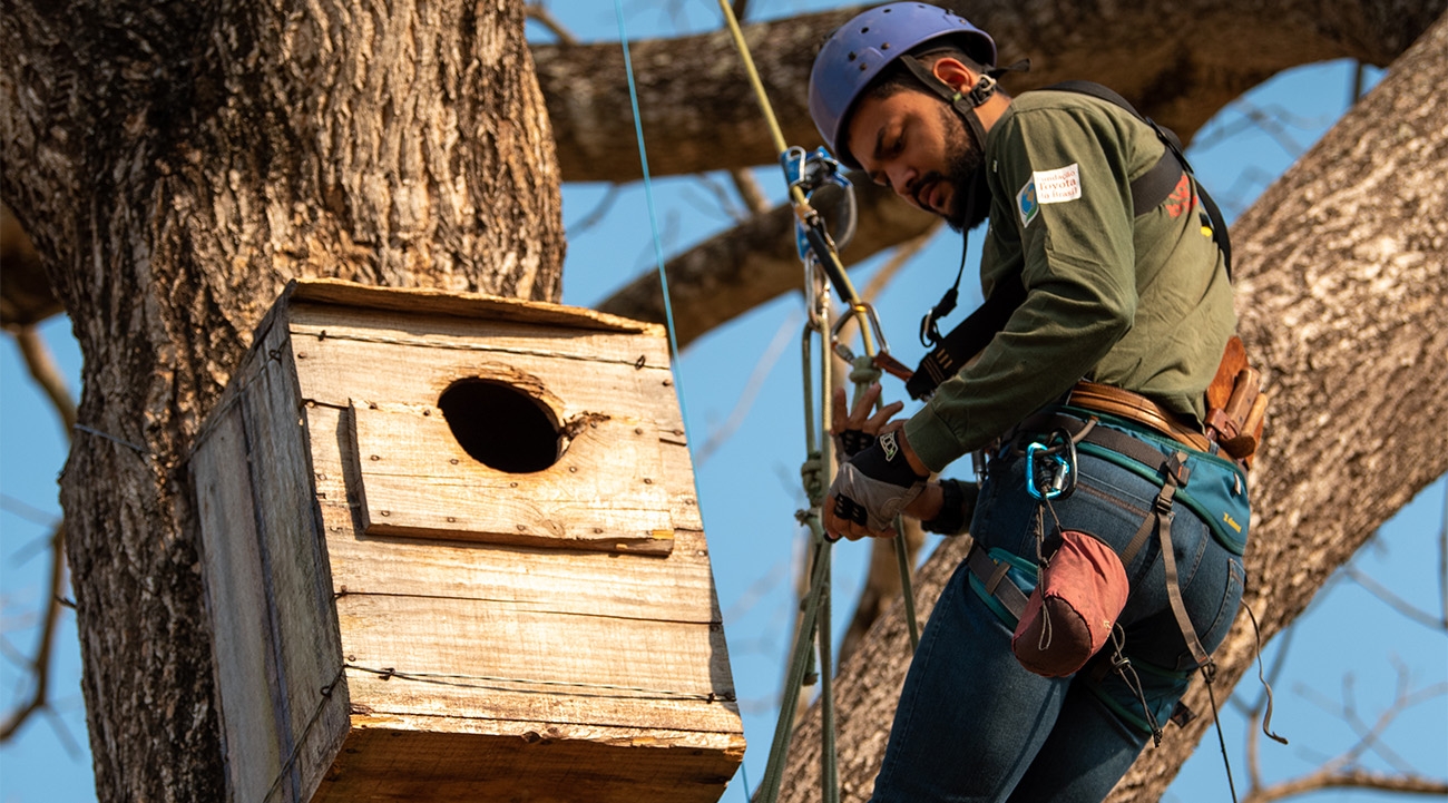 Reliant solely on slow-growing, cavity-filled mandovi trees for nesting sites, the world’s largest parrot has become a victim of deforestation. Birds squark and squabble as field biologist Kefany Ramalho and her colleagues use ropes and harnesses to examine wooden nesting boxes erected in ‘surrogate’ trees.