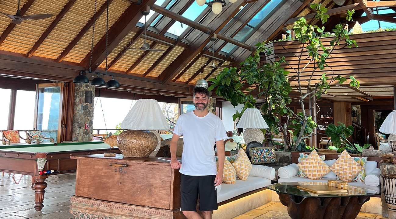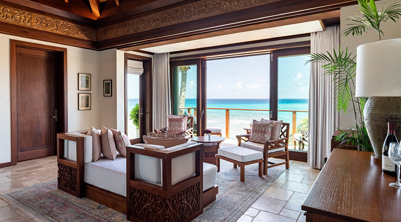 “It was very scary,” Richard tells me. “We all hid in the wine cellar as the wind howled outside. When we came out 14 hours later, there wasn’t a single palm tree still standing.” Now in its third reincarnation, the Great House remains the beating heart of the island. Perched on the island’s highest peak, it has 18 bedrooms and a breezy communal space with stone floors, a swinging day bed (dubbed ‘Richard’s office’, as that’s where he likes to do his emails), bamboo furniture and an indoor garden, all under dramatic ostrich-egg chandeliers.