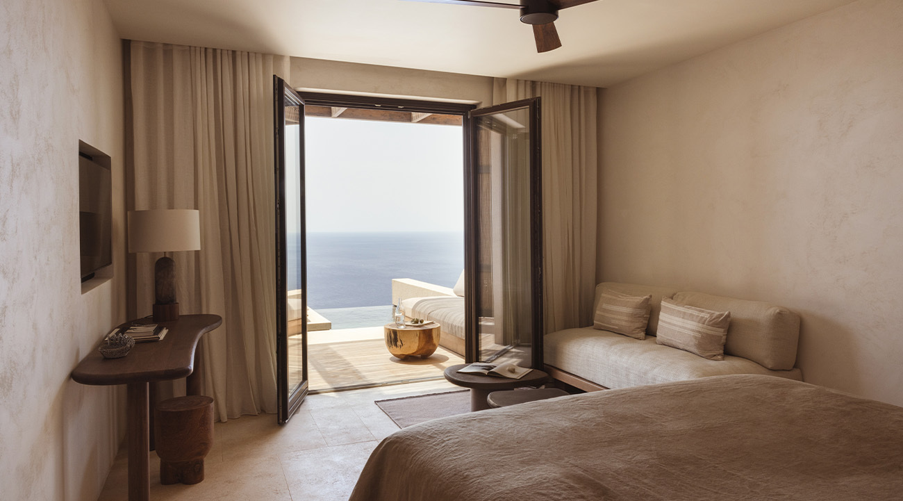 Location: Gundari is the first and only luxury boutique resort on Folegandros, one of four islands that make up the southern Cyclades. The property is tucked away on the southeastern coast, close to the village of Petousis. Folegandros doesn’t have an airport, but is served by daily ferries from Athens and other Cycladic islands. Clients unwilling to navigate Greece’s oft-chaotic ferry system can arrange a private helicopter or boat transfer.