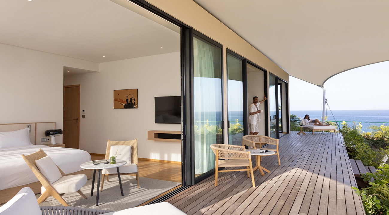 As I enter my room, the sun is sinking below the horizon, setting the tone for a relaxing few days ahead. The decor is very minimalist: natural wood, ivory furnishings and an abundance of sunlight, further adding to the tranquil atmosphere that envelops the resort.