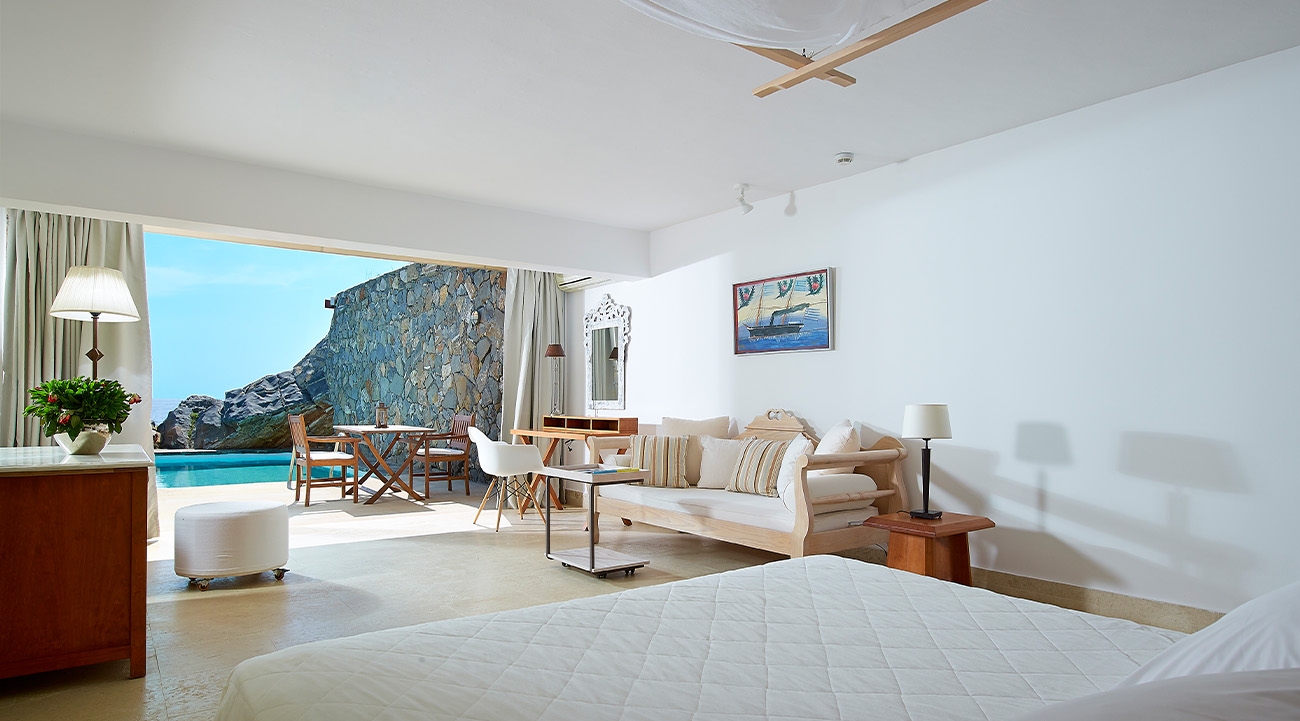 The facts: St Nicolas Bay Resort boasts 125 spacious sea-facing suites, 30 of which have private pools. Another 14 are slated for 2023 as part of a new development. During lockdown the management renovated all the rooms, which are tastefully decorated in a mix of traditional classic and modern minimalist styling.